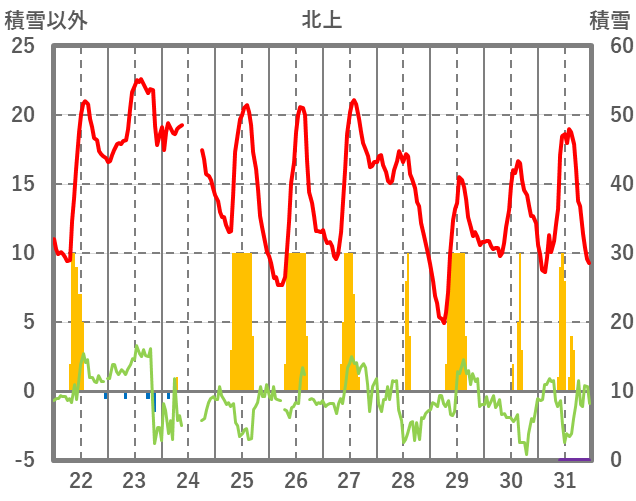 | 日 | 時 | 気温 | 降水 | 風向/風速 | 日照 | 積雪 | 降雪 |