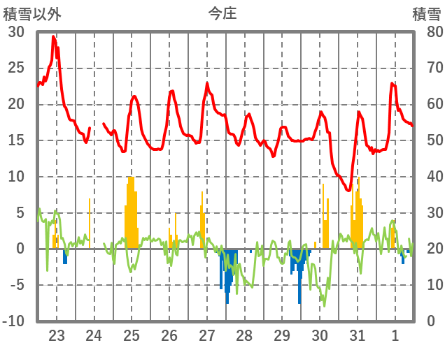 | 日 | 時 | 気温 | 降水 | 風向/風速 | 日照 | 積雪 | 降雪 |