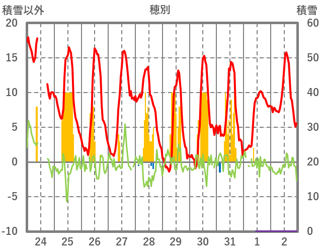 | 日 | 時 | 気温 | 降水 | 風向/風速 | 日照 | 積雪 | 降雪 |