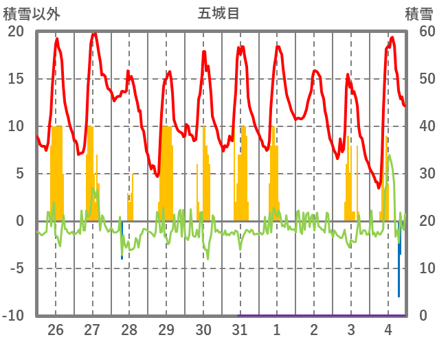 | 日 | 時 | 気温 | 降水 | 風向/風速 | 日照 | 積雪 | 降雪 |