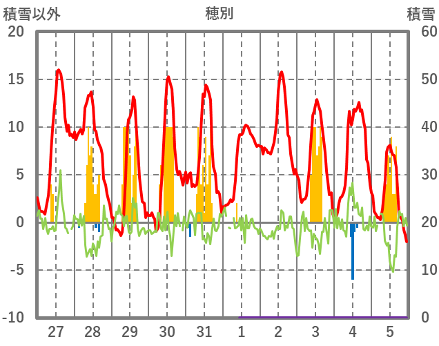 | 日 | 時 | 気温 | 降水 | 風向/風速 | 日照 | 積雪 | 降雪 |