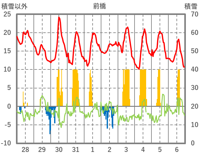 | 日 | 時 | 気温 | 降水 | 風向/風速 | 日照 | 積雪 | 降雪 |
