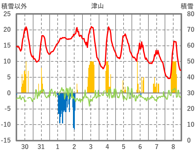 | 日 | 時 | 気温 | 降水 | 風向/風速 | 日照 | 積雪 | 降雪 |
