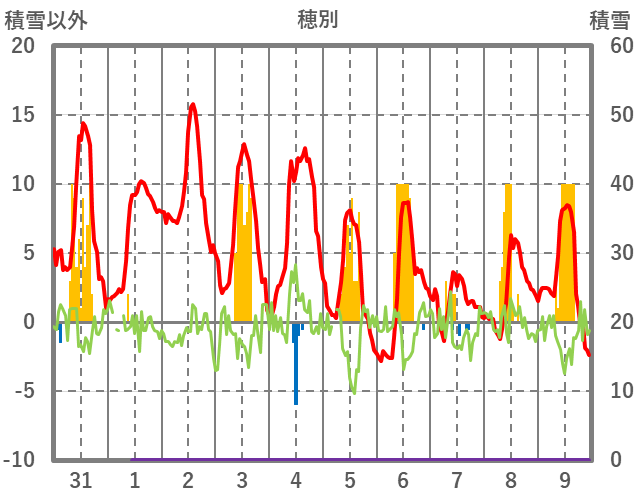 | 日 | 時 | 気温 | 降水 | 風向/風速 | 日照 | 積雪 | 降雪 |