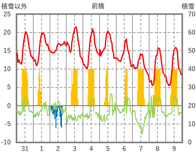 | 日 | 時 | 気温 | 降水 | 風向/風速 | 日照 | 積雪 | 降雪 |