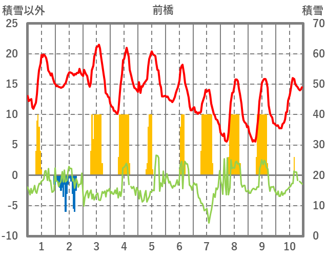 | 日 | 時 | 気温 | 降水 | 風向/風速 | 日照 | 積雪 | 降雪 |