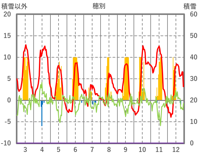 | 日 | 時 | 気温 | 降水 | 風向/風速 | 日照 | 積雪 | 降雪 |