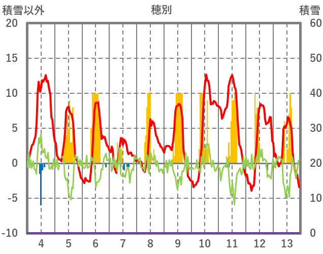 | 日 | 時 | 気温 | 降水 | 風向/風速 | 日照 | 積雪 | 降雪 |