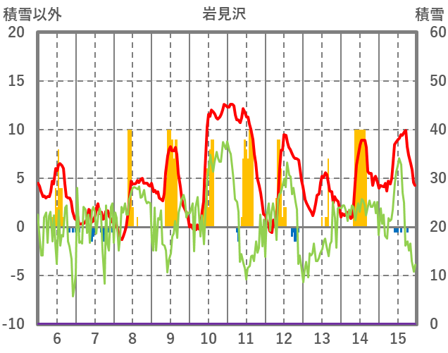 | 日 | 時 | 気温 | 降水 | 風向/風速 | 日照 | 積雪 | 降雪 |