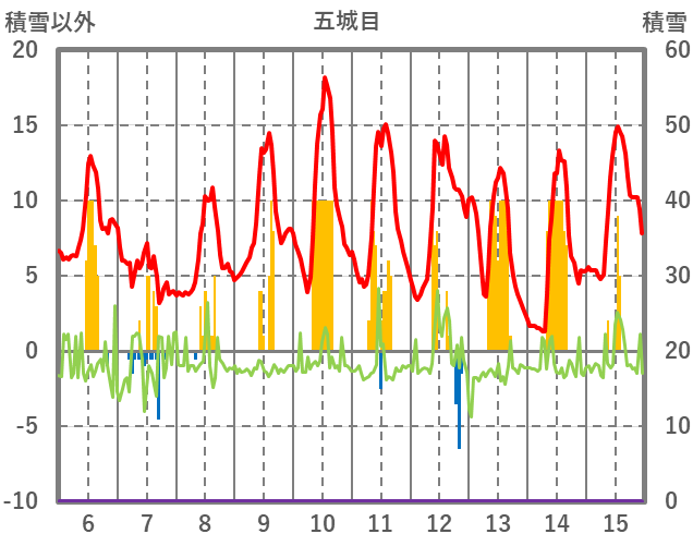 | 日 | 時 | 気温 | 降水 | 風向/風速 | 日照 | 積雪 | 降雪 |