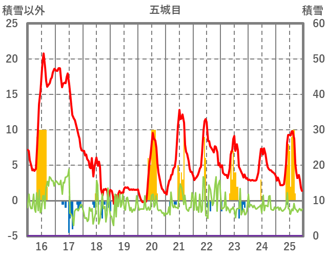 | 日 | 時 | 気温 | 降水 | 風向/風速 | 日照 | 積雪 | 降雪 |