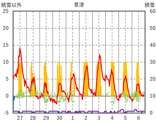| 日 | 時 | 気温 | 降水 | 風向/風速 | 日照 | 積雪 | 降雪 |
