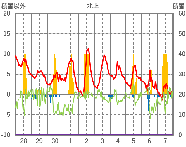 | 日 | 時 | 気温 | 降水 | 風向/風速 | 日照 | 積雪 | 降雪 |