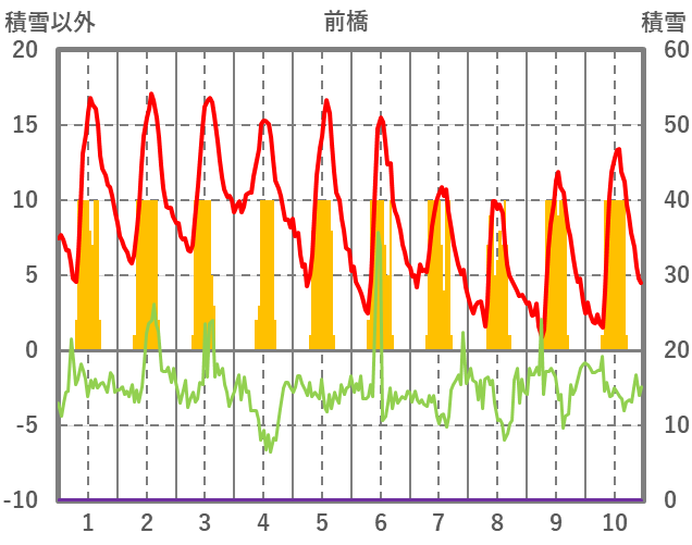 | 日 | 時 | 気温 | 降水 | 風向/風速 | 日照 | 積雪 | 降雪 |