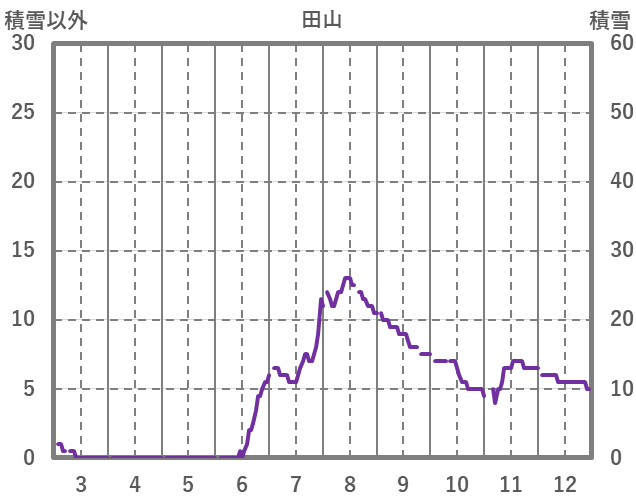 | 日 | 時 | 気温 | 降水 | 風向/風速 | 日照 | 積雪 | 降雪 |