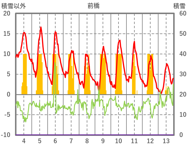 | 日 | 時 | 気温 | 降水 | 風向/風速 | 日照 | 積雪 | 降雪 |