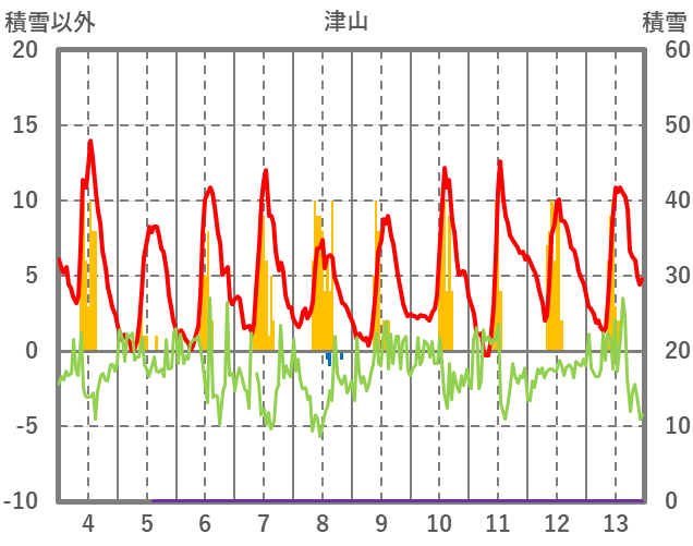 | 日 | 時 | 気温 | 降水 | 風向/風速 | 日照 | 積雪 | 降雪 |