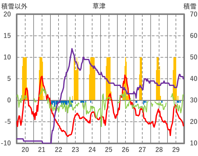 | 日 | 時 | 気温 | 降水 | 風向/風速 | 日照 | 積雪 | 降雪 |