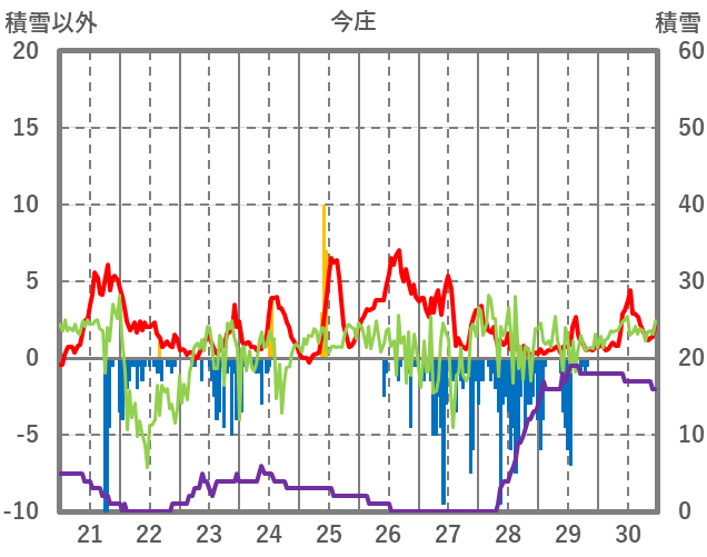 | 日 | 時 | 気温 | 降水 | 風向/風速 | 日照 | 積雪 | 降雪 |