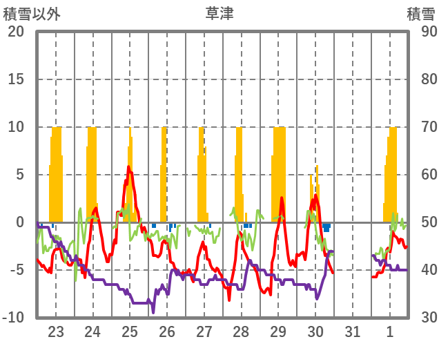 | 日 | 時 | 気温 | 降水 | 風向/風速 | 日照 | 積雪 | 降雪 |