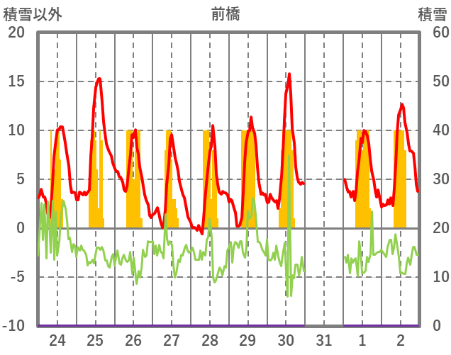 | 日 | 時 | 気温 | 降水 | 風向/風速 | 日照 | 積雪 | 降雪 |