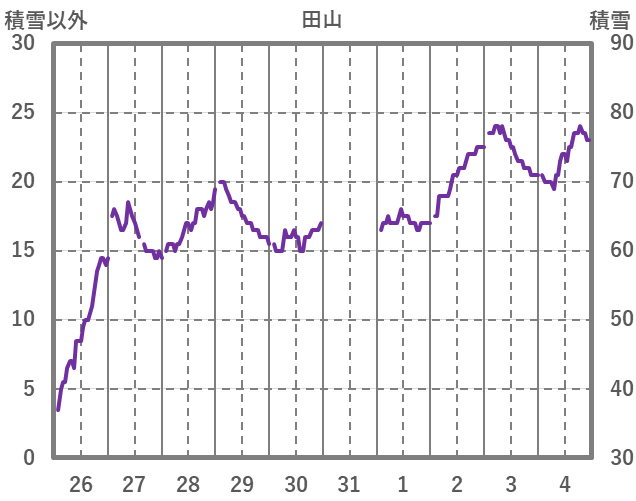 | 日 | 時 | 気温 | 降水 | 風向/風速 | 日照 | 積雪 | 降雪 |