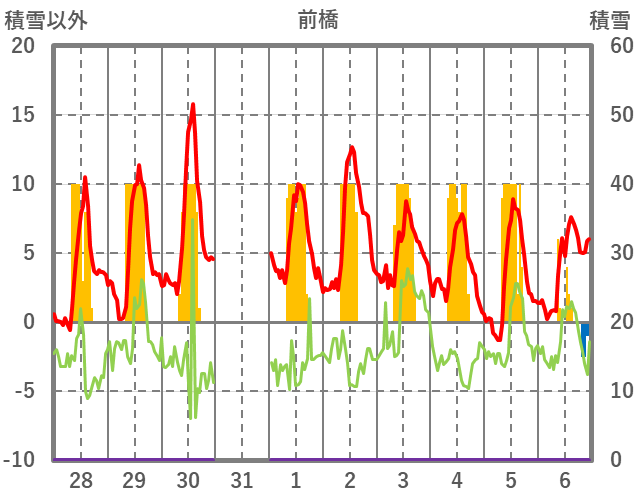 | 日 | 時 | 気温 | 降水 | 風向/風速 | 日照 | 積雪 | 降雪 |