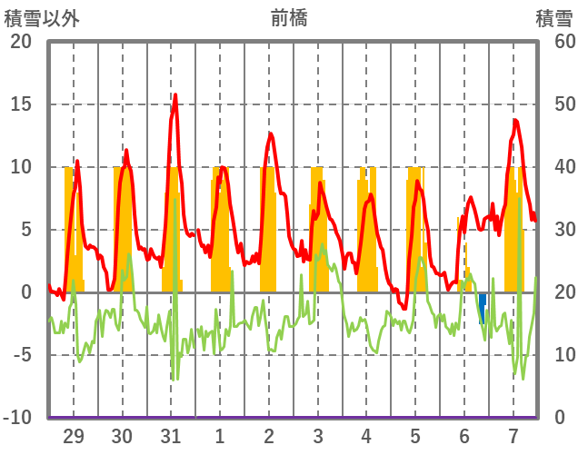 | 日 | 時 | 気温 | 降水 | 風向/風速 | 日照 | 積雪 | 降雪 |