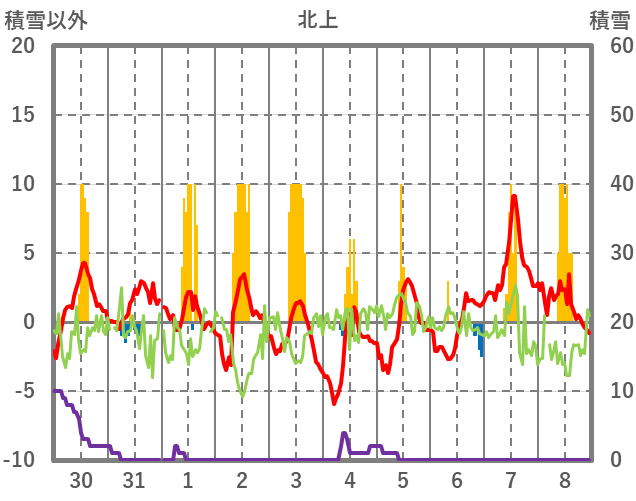| 日 | 時 | 気温 | 降水 | 風向/風速 | 日照 | 積雪 | 降雪 |