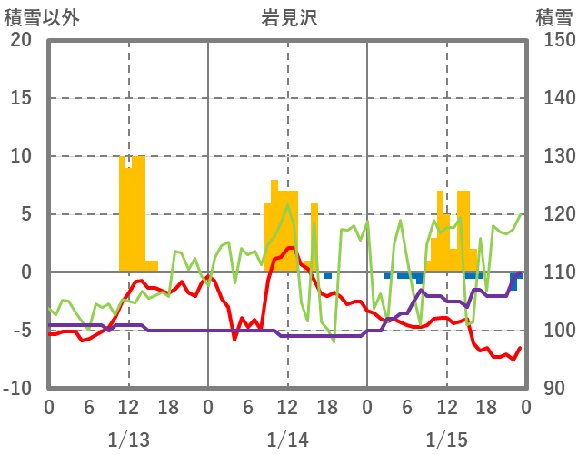 | 日 | 時 | 気温 | 降水 | 風向/風速 | 日照 | 積雪 | 降雪 |