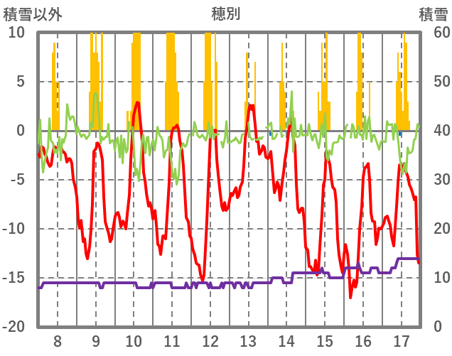 | 日 | 時 | 気温 | 降水 | 風向/風速 | 日照 | 積雪 | 降雪 |