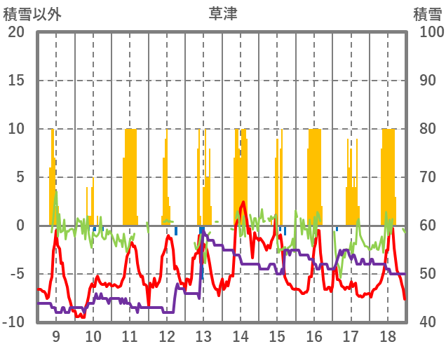 | 日 | 時 | 気温 | 降水 | 風向/風速 | 日照 | 積雪 | 降雪 |
