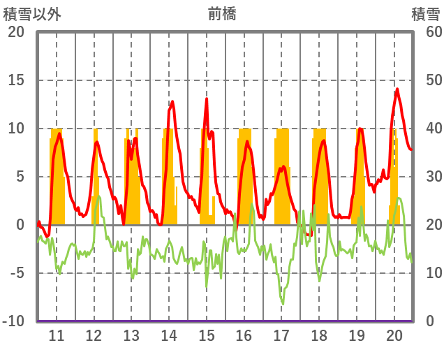 | 日 | 時 | 気温 | 降水 | 風向/風速 | 日照 | 積雪 | 降雪 |