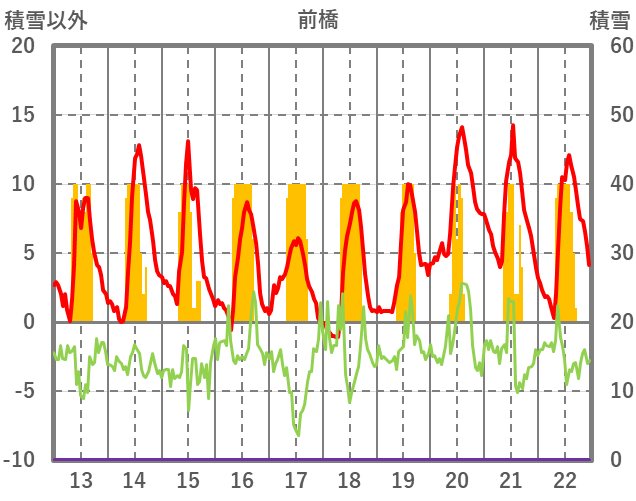 | 日 | 時 | 気温 | 降水 | 風向/風速 | 日照 | 積雪 | 降雪 |
