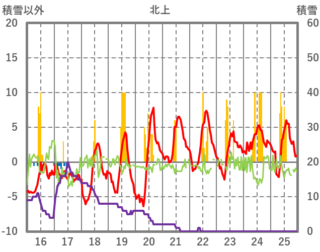 | 日 | 時 | 気温 | 降水 | 風向/風速 | 日照 | 積雪 | 降雪 |