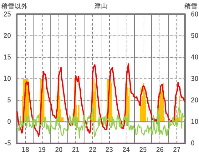 | 日 | 時 | 気温 | 降水 | 風向/風速 | 日照 | 積雪 | 降雪 |