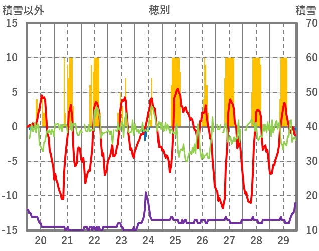 | 日 | 時 | 気温 | 降水 | 風向/風速 | 日照 | 積雪 | 降雪 |