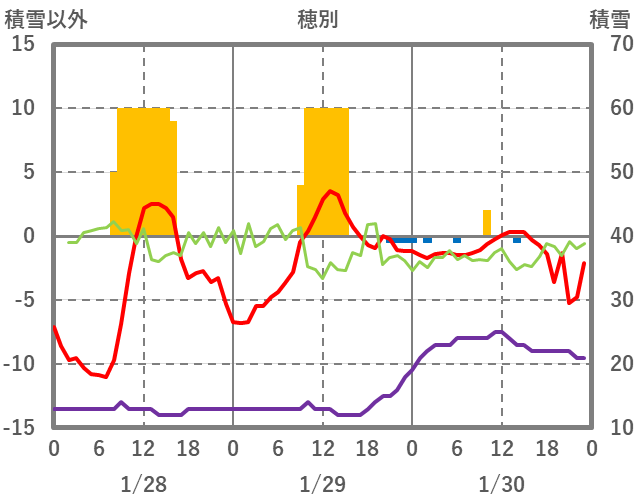 | 日 | 時 | 気温 | 降水 | 風向/風速 | 日照 | 積雪 | 降雪 |