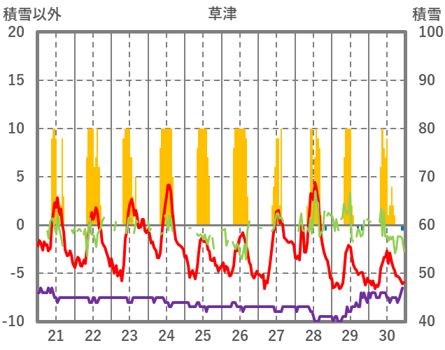 | 日 | 時 | 気温 | 降水 | 風向/風速 | 日照 | 積雪 | 降雪 |