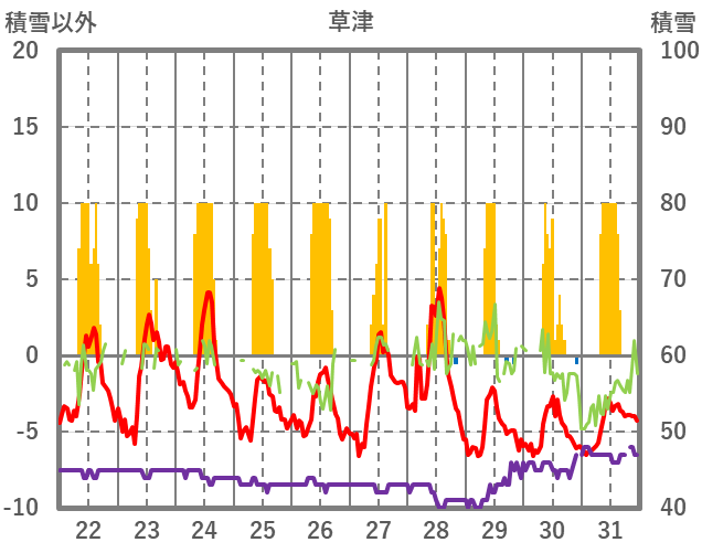 | 日 | 時 | 気温 | 降水 | 風向/風速 | 日照 | 積雪 | 降雪 |