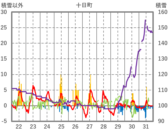 | 日 | 時 | 気温 | 降水 | 風向/風速 | 日照 | 積雪 | 降雪 |