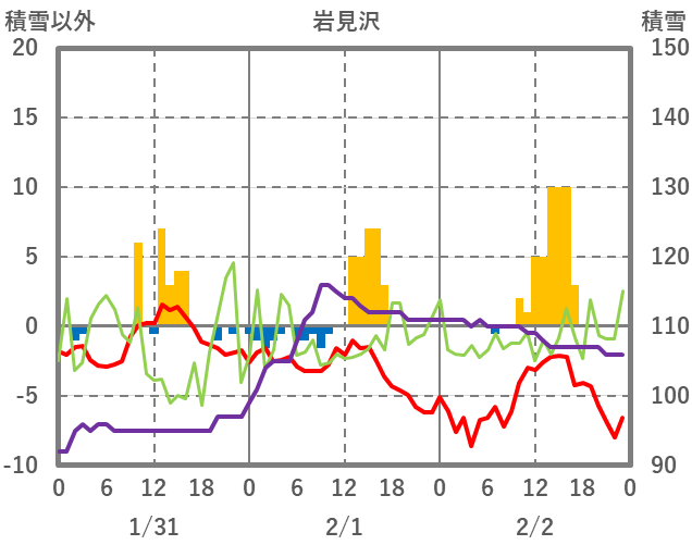 | 日 | 時 | 気温 | 降水 | 風向/風速 | 日照 | 積雪 | 降雪 |