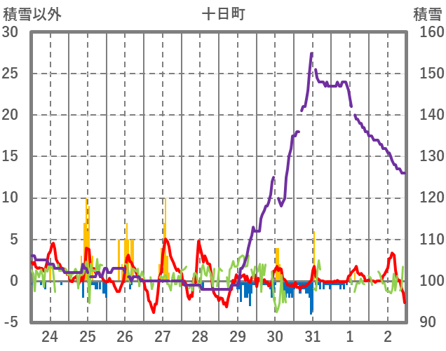 | 日 | 時 | 気温 | 降水 | 風向/風速 | 日照 | 積雪 | 降雪 |