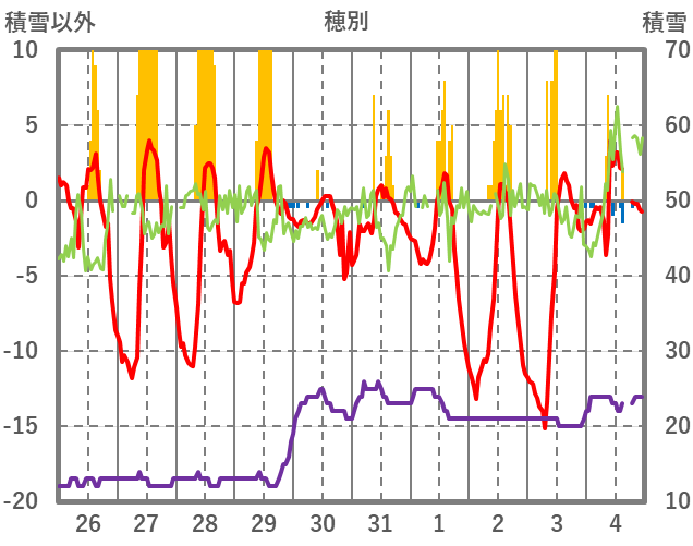 | 日 | 時 | 気温 | 降水 | 風向/風速 | 日照 | 積雪 | 降雪 |