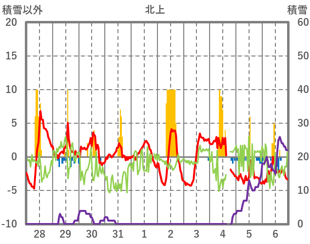 | 日 | 時 | 気温 | 降水 | 風向/風速 | 日照 | 積雪 | 降雪 |