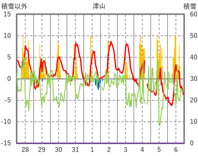 | 日 | 時 | 気温 | 降水 | 風向/風速 | 日照 | 積雪 | 降雪 |