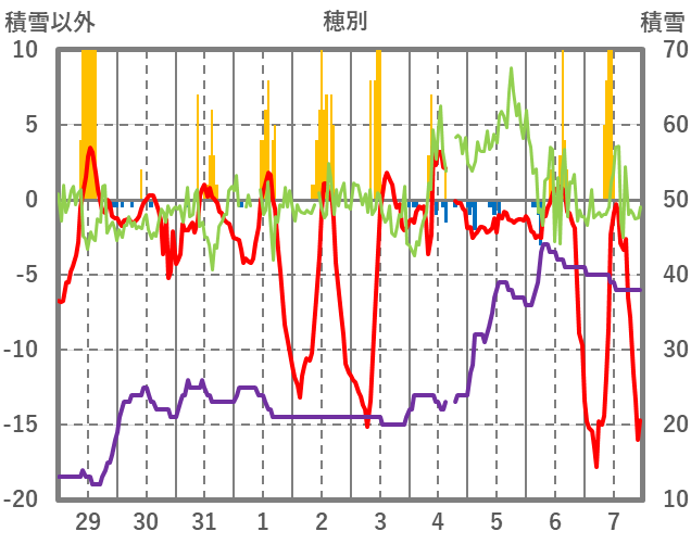 | 日 | 時 | 気温 | 降水 | 風向/風速 | 日照 | 積雪 | 降雪 |