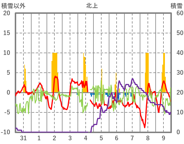 | 日 | 時 | 気温 | 降水 | 風向/風速 | 日照 | 積雪 | 降雪 |