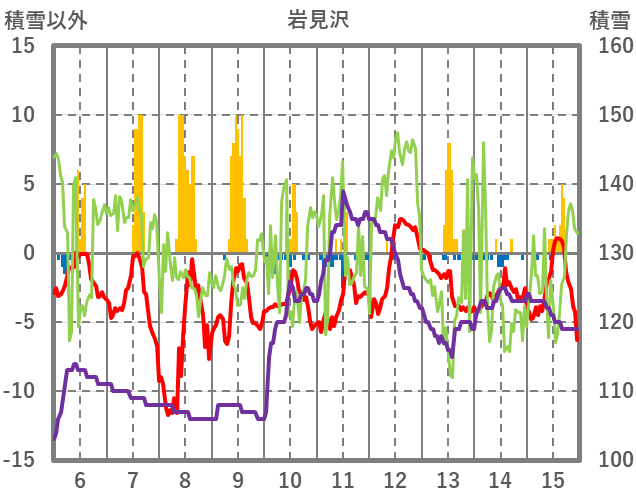 | 日 | 時 | 気温 | 降水 | 風向/風速 | 日照 | 積雪 | 降雪 |