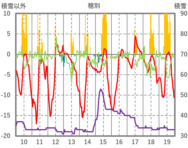| 日 | 時 | 気温 | 降水 | 風向/風速 | 日照 | 積雪 | 降雪 |